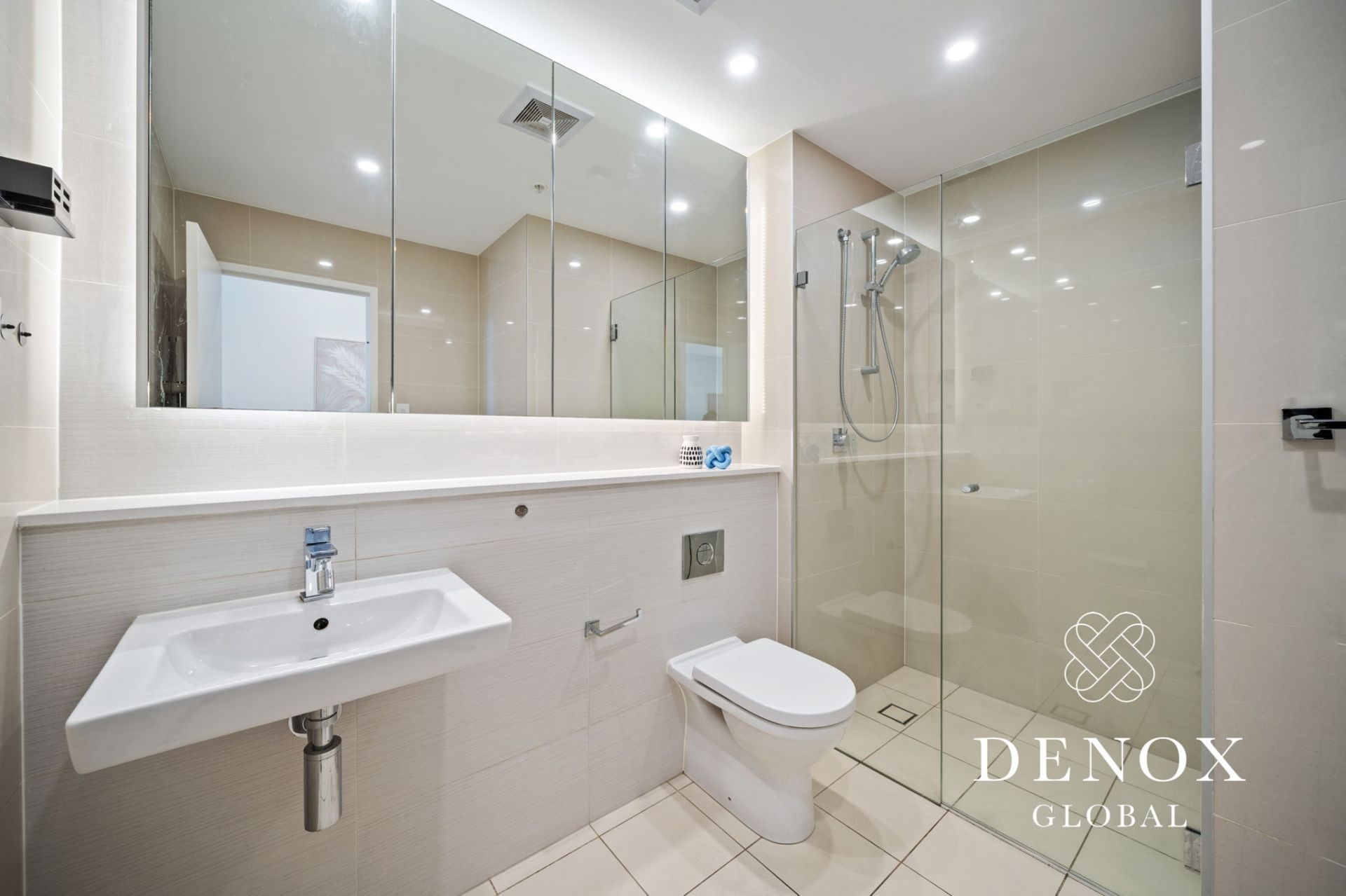 - Sleek bathroom finished with floor to ceiling tiles, semi frameless shower, and additional vanity storage