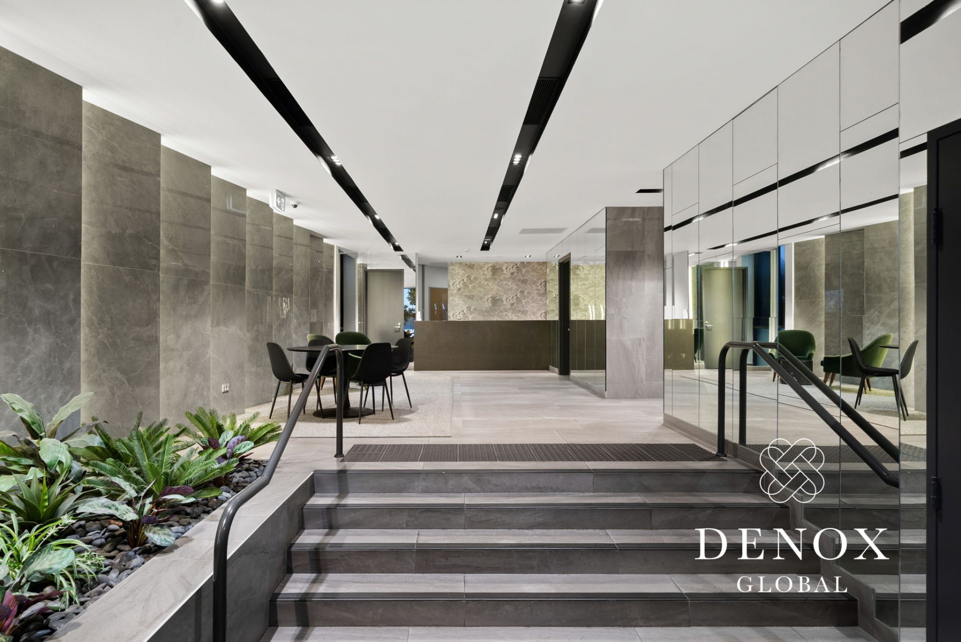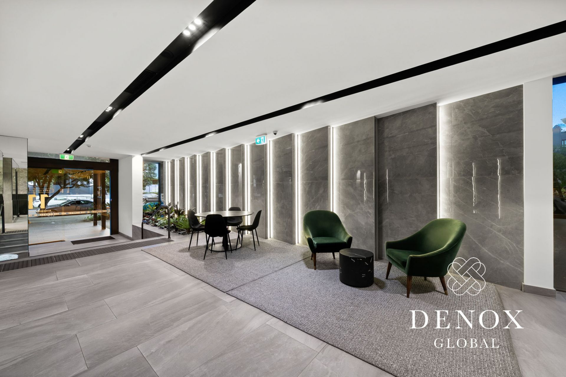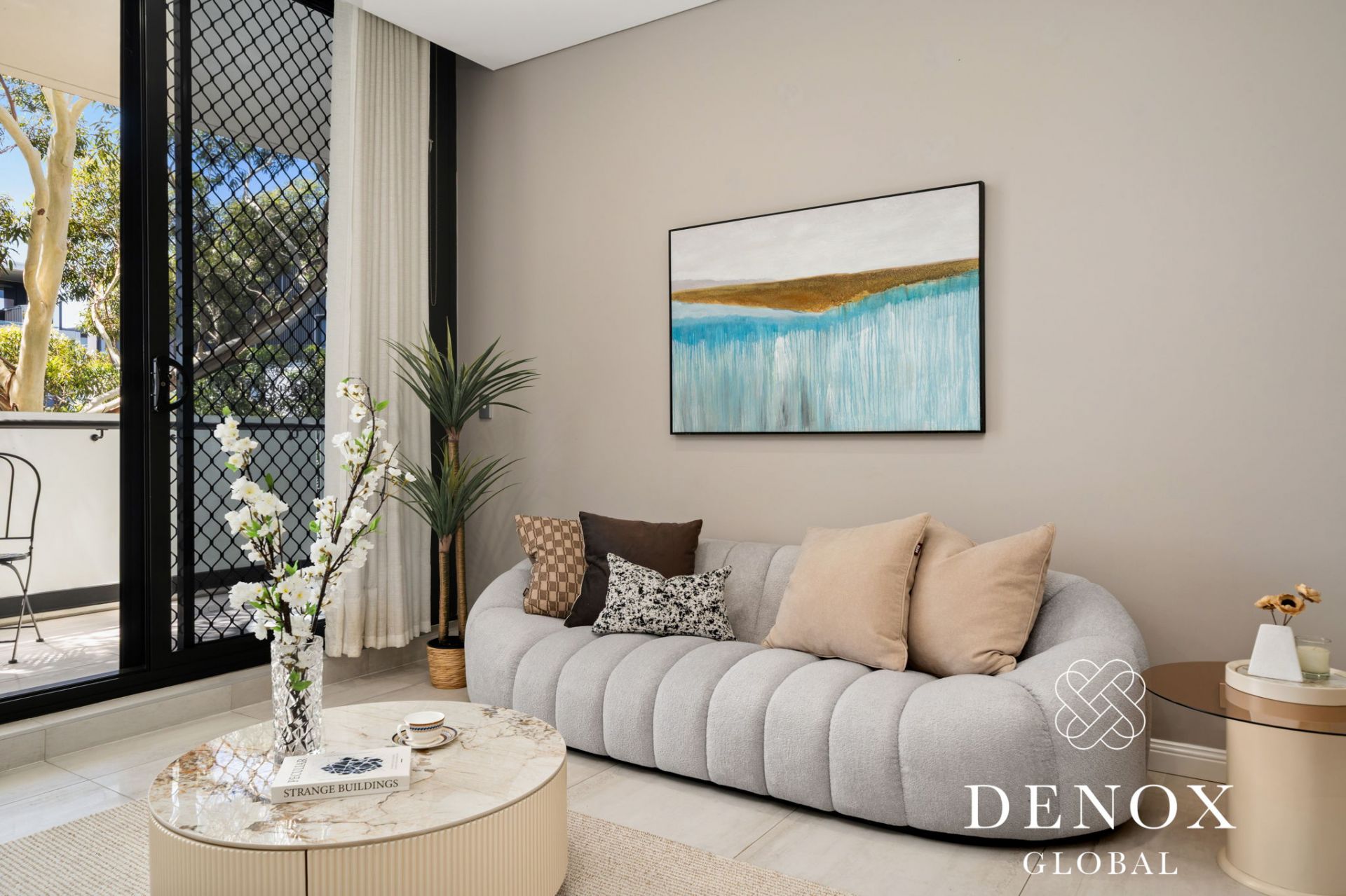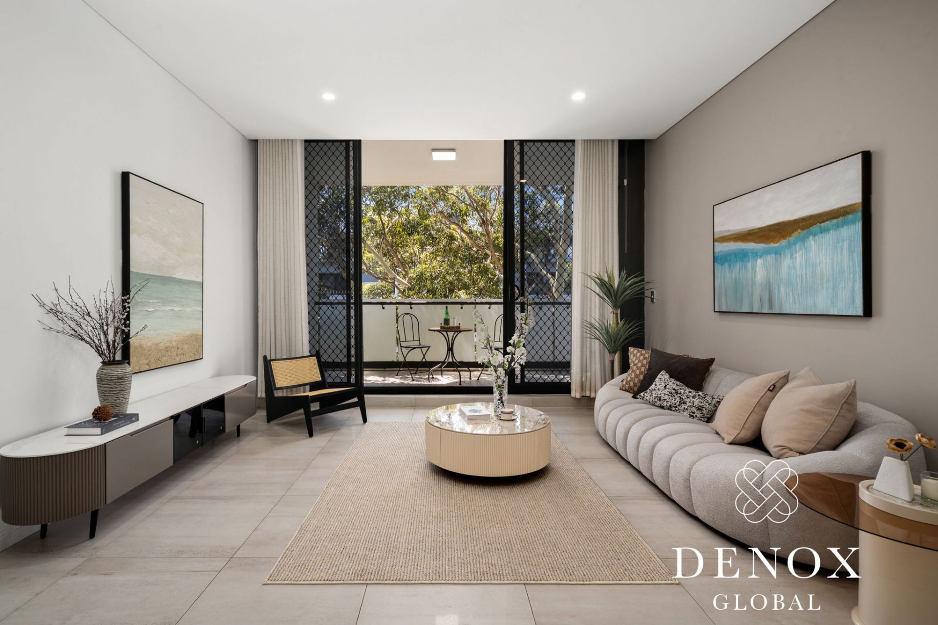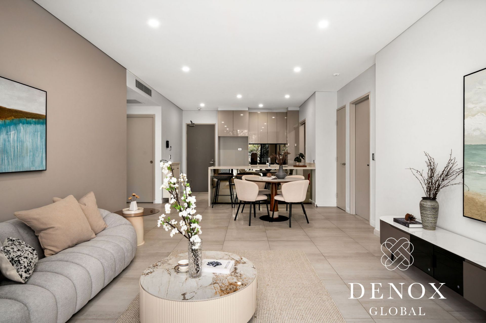 - Expansive open-plan living and dining area with large format limestone tiles, seamlessly flowing to the balcony.
