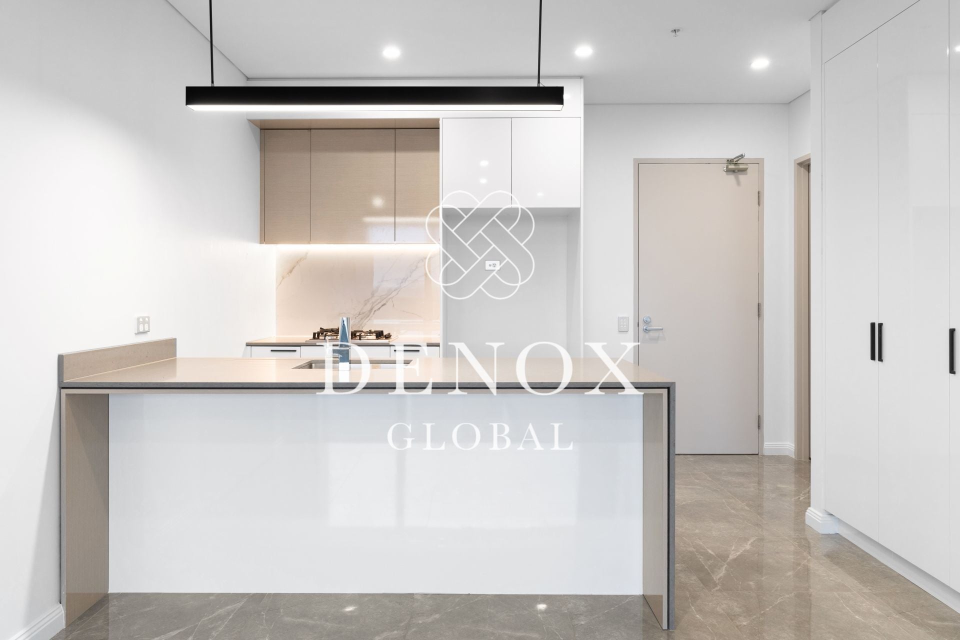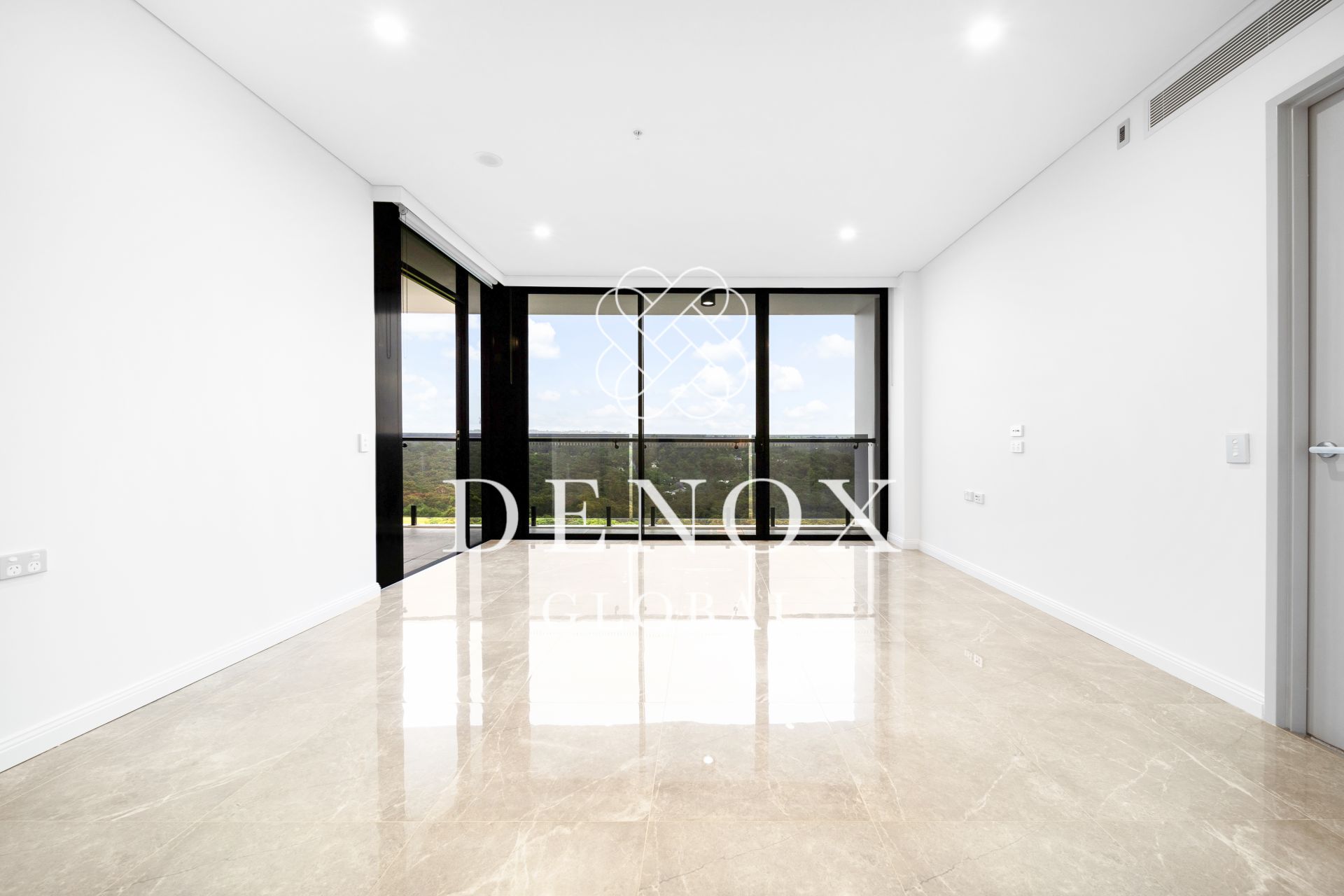 +Open plan living and dining that flows into the balcony with marble-inspired tiling