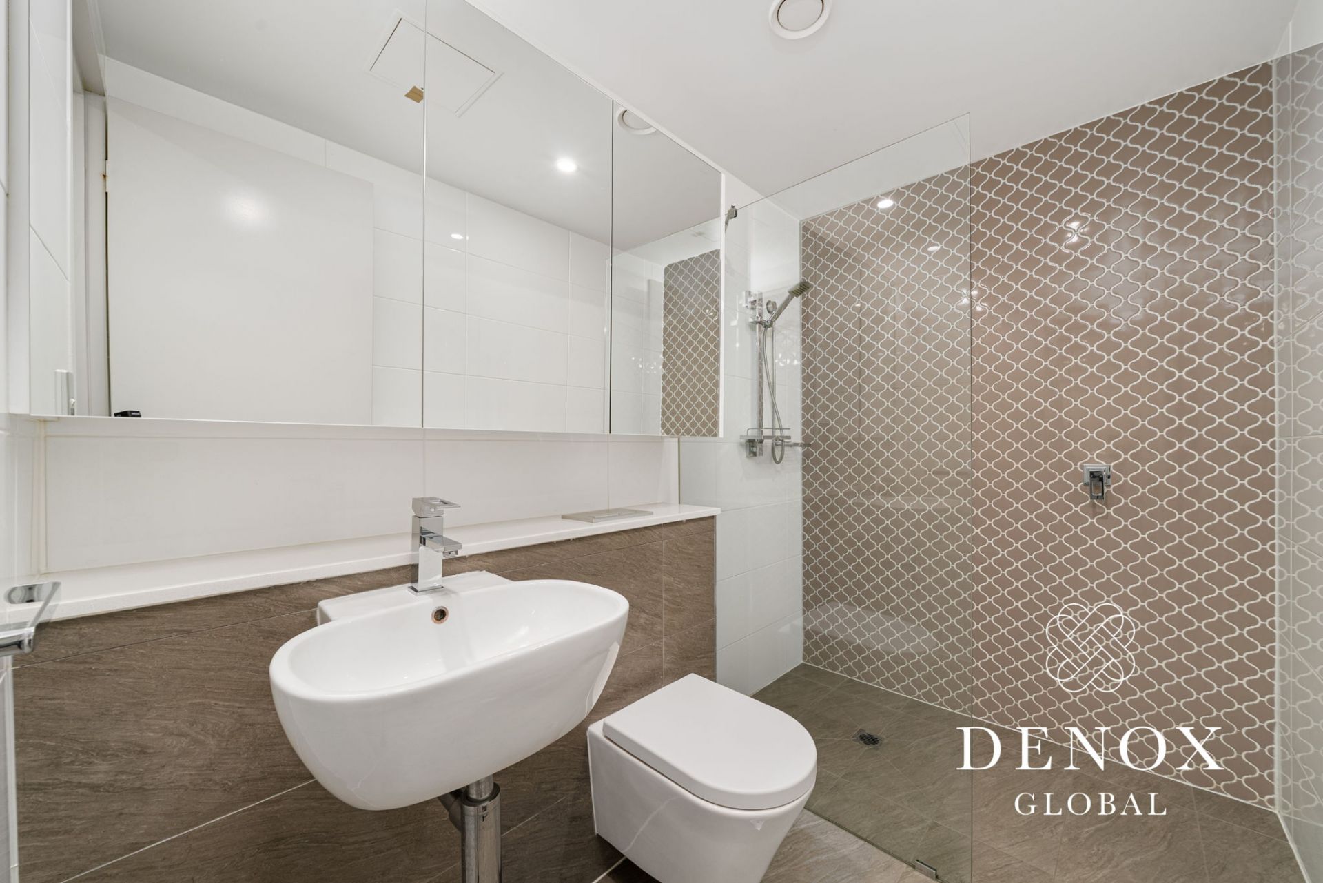 - Sleek modern bathroom with floor-to-ceiling tiles, frameless glass shower, mirrored vanity, and storage cupboard
