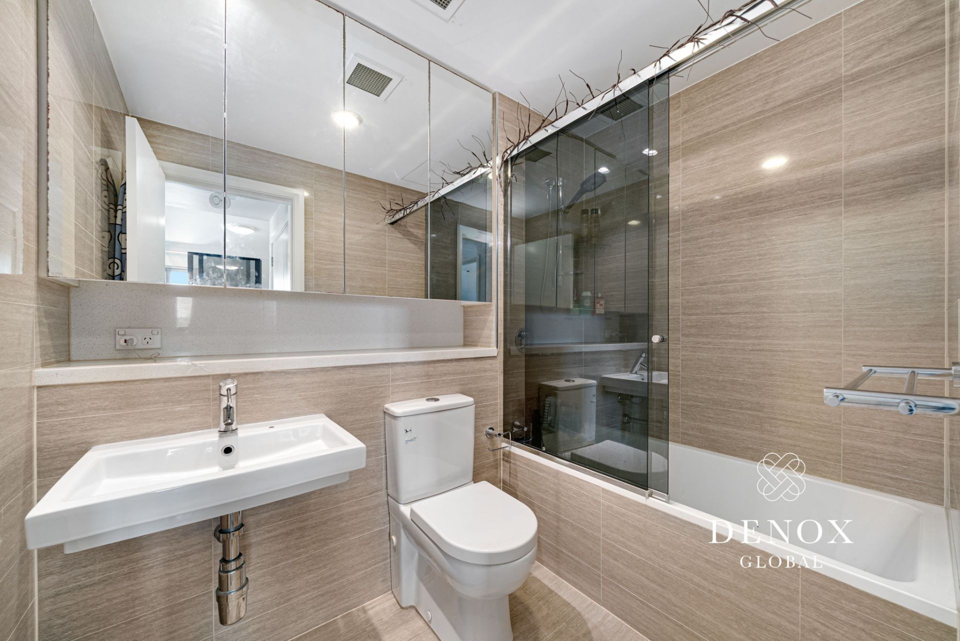 - Modern bathroom with a new shower screen, bath tub and shower combo and vanity storage