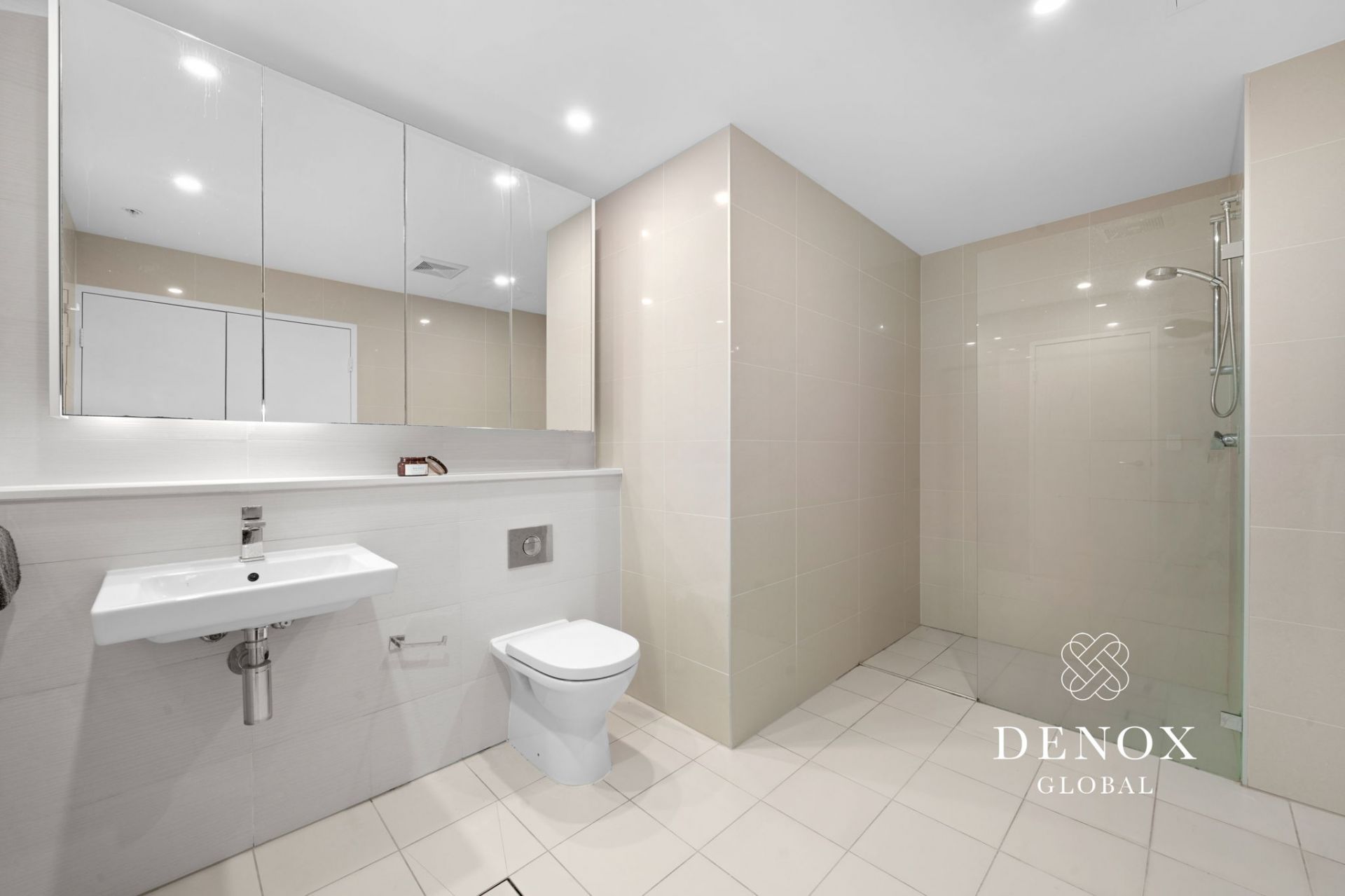 -Contemporary bathroom with floor-to-ceiling tiles and a frameless shower