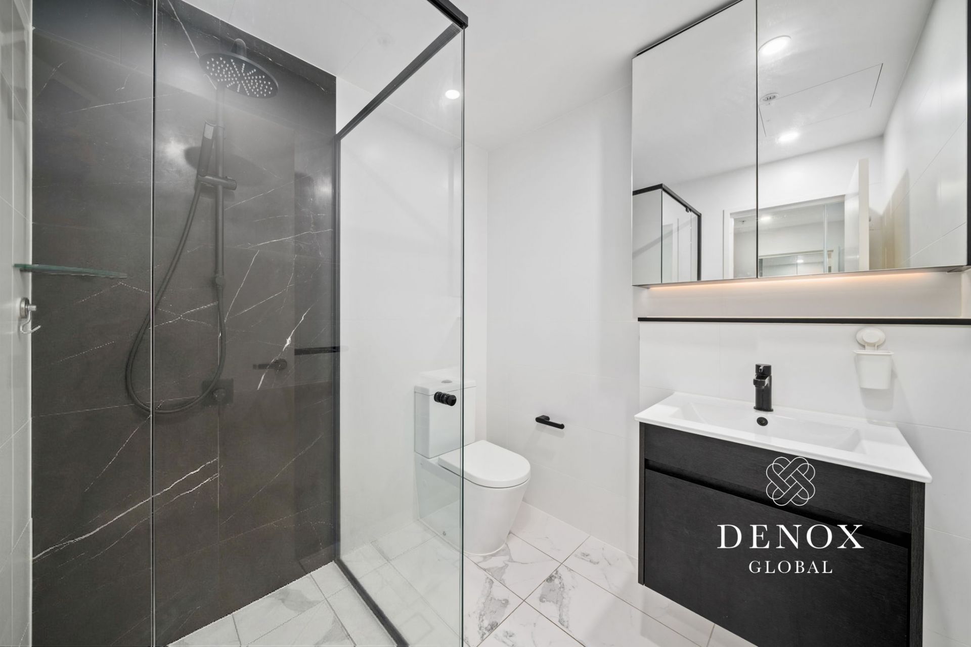 - Sleek modern bathrooms with floor to ceiling tiles, feature wall, and vanity storage
